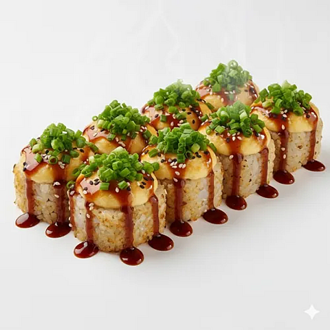 Запеченный ролл с тунцом и крабом сочетает в себе нежное мясо тунца, крабовую палочку и свежий лук-перо, что создает гармоничный вкус и аромат. Сверху ролл покрыт сырной шапкой, которая придает блюду аппетитную золотистую корочку. Полит с соусом Унаги, что дополнительно подчеркивает его изысканность. Состав: Филе тунца, краб (сурими), творожный сыр (п/ф), зеленый лук, рис, нори. Топпинг: Фирменная сырная шапка, соус унаги.