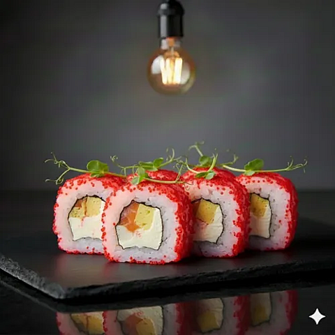 Истинное воплощение роскоши и эксклюзива в LACRES FOOD. Нежный атлантический лосось в сочетании с изысканной красной икрой и яркой свежестью сочного апельсина. Главная особенность этого шедевра — благородное золотое сияние (пищевой кандурин), которое превращает ваш ужин в событие мирового уровня. Ролл для тех, кто привык брать от жизни лучшее.