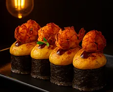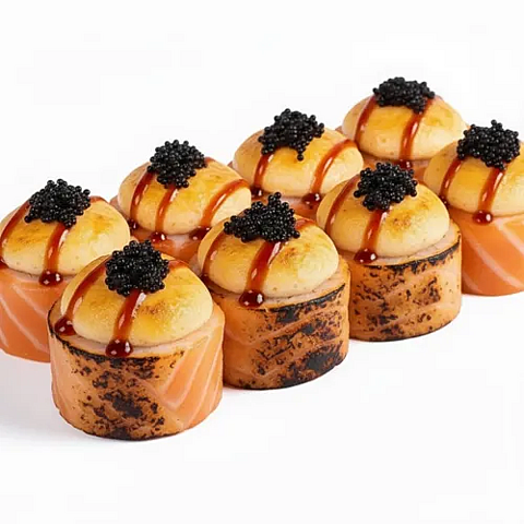 Изысканный тандем двух главных морских деликатесов. Внутри — нежное филе атлантического лосося в сочетании со сливочным сыром и хрустящей икрой масаго. Сверху ролл укрыт пышной сырной шапкой, на которой гордо располагается тигровая креветка. Насыщенный вкус, благородная текстура и эффектная подача делают этот ролл фаворитом праздничных ужинов.