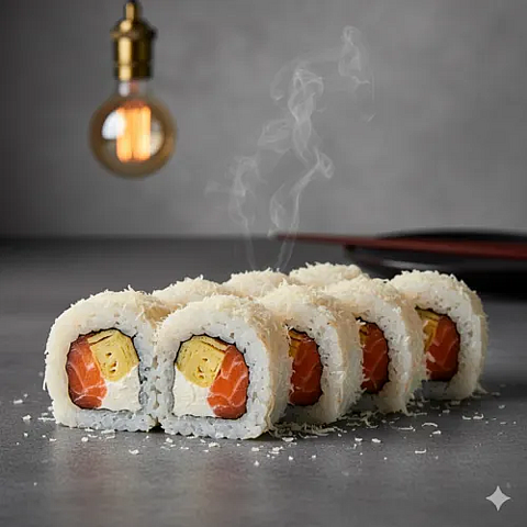 Состав: Нежный лосось, японский омлет Томаго, сливочный крем-сыр, свежий огурец, рис, нори и тертый пармезан. *Внимание: имбирь, соевый соус, васаби и палочки не входят в стоимость блюд категории Smart.