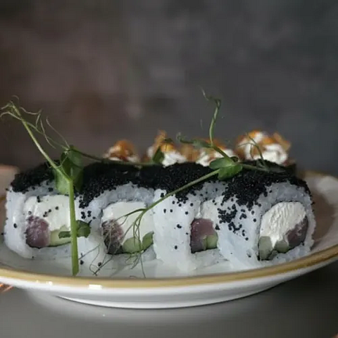 Состав: Филе тунца (премиальная нарезка), нежный сливочный сыр, икра масаго, свежий огурец, кунжутный соус, рис и нори