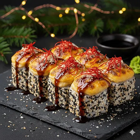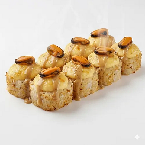 Ролл с запеченными мидиями с крабовой палочкой и болгарским перцем запеченный под сырной шапкой. Этот блюдо сочетает в себе морской вкус мидий и нежность кремового сыра, создавая гармонию текстур и ароматов. Состав: Филе мидий, краб (сурими), творожный сыр, болгарский перец, рис, нори. Топпинг: Фирменная сырная шапка, соус унаги.