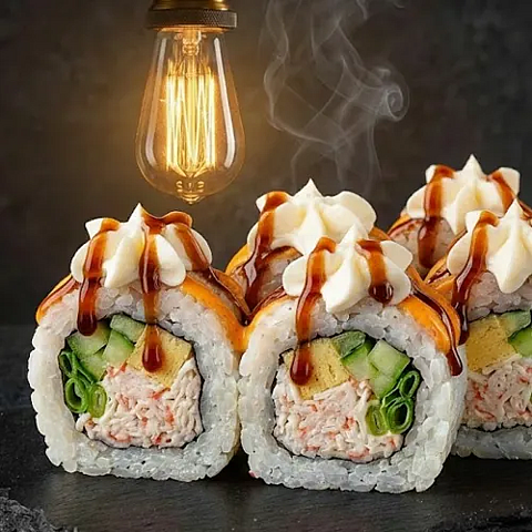 Состав: Снежный краб, японский омлет Томаго, нежный сливочный сыр, острый спайси-соус, густой унаги-соус и хрустящий лук кранч. *Внимание: имбирь, соевый соус, васаби и палочки не входят в стоимость блюд категории Smart.